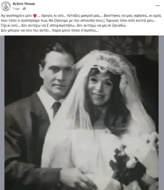 «Αχ αγαπημένε μου, έφυγες και εσύ, πέταξες μακριά μας. Βιάστηκες να μας αφήσεις και εμείς που τόσο σε αγαπήσαμε πως θα ζήσουμε με την απουσία σου; Έφυγαν όλοι από κοντά μου. Όχι και εσύ. Δεν αντέχω να σε αποχαιρετήσω, δεν αντέχω να μη σε ξαναδώ. Δεν μπορώ να σου πω αντίο, παρά μόνο πόσο σε αγαπώ», ανέφερε η ηθοποιός στη δημοσίευση.
