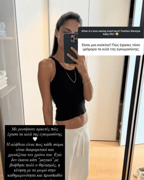 Όσο για την επαναφορά μετά την εγκυμοσύνη, η Αλεξάνδρα τόνισε ότι δεν ακολούθησε κάποια μαγική δίαιτα. «Κάθε σώμα έχει τους δικούς του ρυθμούς. Με βοήθησε πολύ ο θηλασμός, η καθημερινή κίνηση με το μωρό και η ισορροπημένη διατροφή. Το σημαντικότερο ήταν να νιώσω υγιής και δυνατή», ανέφερε.