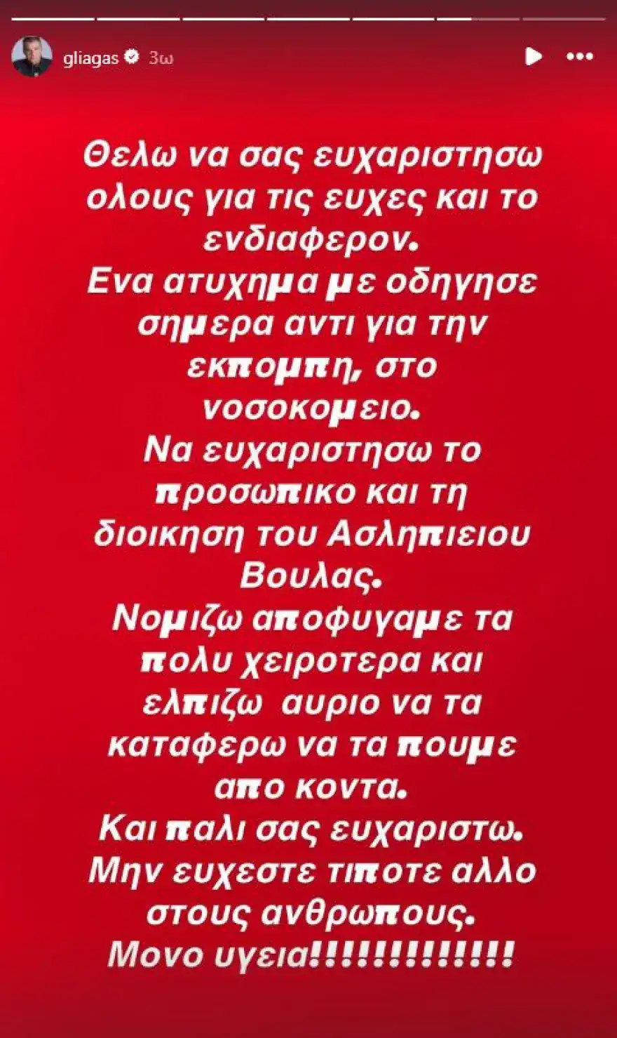 Στην δημοσίευση που έκανε, ανέφερε χαρακτηριστικά: «Θέλω να σας ευχαριστήσω όλους για τις ευχές και το ενδιαφέρον. Ένα ατύχημα με οδήγησε σήμερα αντί για την εκπομπή στο νοσοκομείο. Να ευχαριστήσω το προσωπικό και τη διοίκηση του Ασκληπιείο Βούλας. Νομίζω αποφύγαμε τα πολύ χειρότερα και ελπίζω αύριο να τα καταφέρω να τα πούμε από κοντά. Και πάλι σας ευχαριστώ. Μην εύχεστε τίποτα άλλο στους ανθρώπους. Μόνο υγεία!».