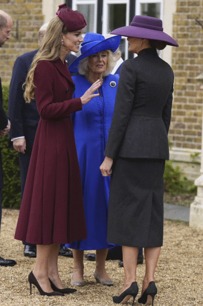 Μετά τους τυπικούς χαιρετισμούς, οι άνδρες της συντροφιάς σχημάτισαν το δικό τους πηγαδάκι συζητώντας με τον βασιλιά Κάρολο, ενώ οι γυναίκες βρέθηκαν λίγο πιο πέρα. Στην αρχή, η βασίλισσα Καμίλα και η Μελάνια Τραμπ αντάλλαξαν μερικές κουβέντες. Ωστόσο, όταν η Κέιτ πλησίασε, η ατμόσφαιρα άλλαξε.