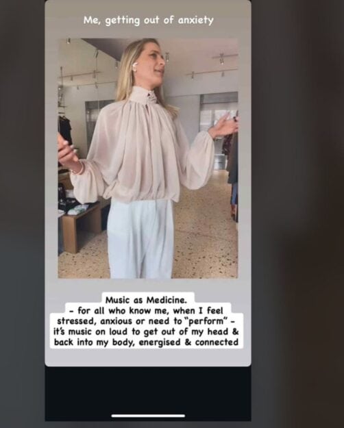 «Η μουσική ως φάρμακο. Για όσους με γνωρίζουν, όταν νιώθω άγχωμένη, πιεσμένη ή όταν έχω ανάγκη να δώσω τη δική μου περφόρμανς, βάζω τη μουσική δυνατά για να βγω από το μυαλό μου και να επιστρέψω στο σώμα μου, γεμάτη ενέργεια και συνδεδεμένη με τον εαυτό μου», έγραψε χαρακτηριστικά.