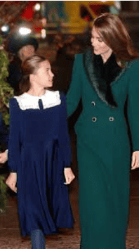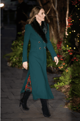 Αν και συνήθως επιλέγει κλασικές εορταστικές αποχρώσεις, όπως το κόκκινο ή το λευκό, όπως πέρυσι που είχε φορέσει ένα έντονο κόκκινο παλτό με μαύρο φιόγκο, αυτήν τη φορά φόρεσε ξανά το forest green παλτό της Catherine Walker, το οποίο είχε πρωτοφορέσει στο ταξίδι της στο Δουβλίνο το 2020.