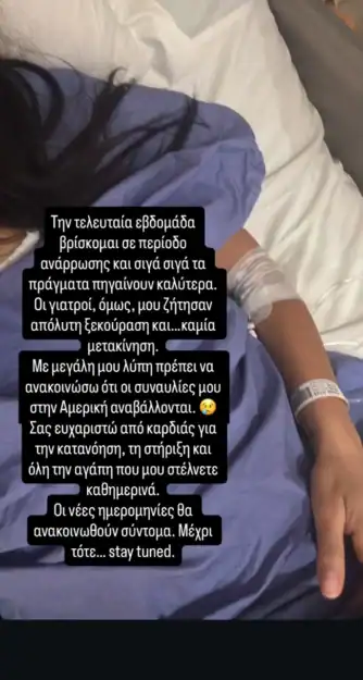 Με μια φωτογραφία από το νοσοκομείο, η τραγουδίστρια γνωστοποίησε ότι βρίσκεται σε φάση ανάρρωσης, αποκαλύπτοντας παράλληλα πως οι γιατροί της συνέστησαν πλήρη ξεκούραση και αποφυγή ταξιδιών. Αν και δεν μοιράστηκε περαιτέρω ιατρικές λεπτομέρειες, τόνισε ότι η υγεία της βαίνει βελτιούμενη, ευχαριστώντας θερμά το κοινό για τη συνεχή στήριξη.