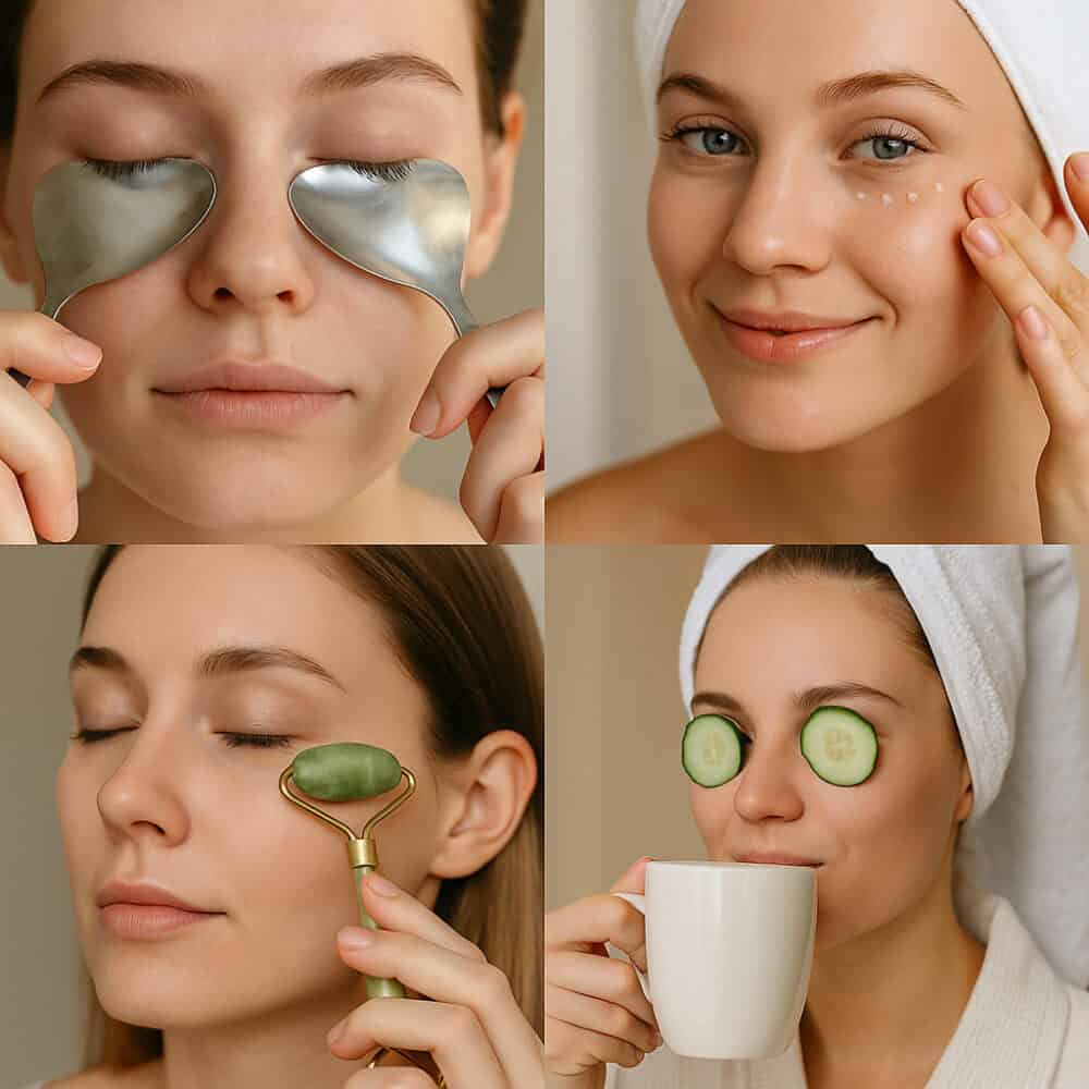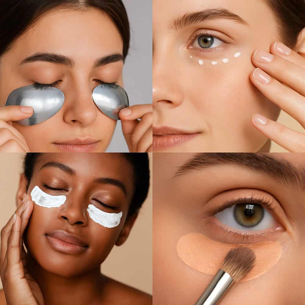 Πέρασε παγωμένα κουτάλια ή eye patches για 3-5 λεπτά. Η ψύξη μειώνει την αγγειοδιαστολή και χαρίζει άμεση φρεσκάδα. -
