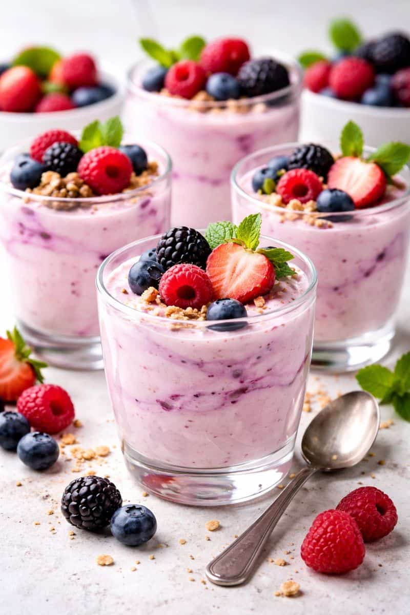Αν ψάχνεις ένα γλυκό ελαφρύ, δροσερό και αρωματικό, αυτή η μους με βάση το γιαούρτι και τα φρούτα του δάσους είναι ιδανική. Συνδυάζει την κρεμώδη υφή του γιαουρτιού με τη φυσική οξύτητα και το άρωμα των μούρων, δημιουργώντας ένα επιδόρπιο που δεν λιγώνει και ταιριάζει τέλεια τόσο μετά από βαρύ γεύμα όσο και ως ένα γλυκό σνακ μέσα στη μέρα.