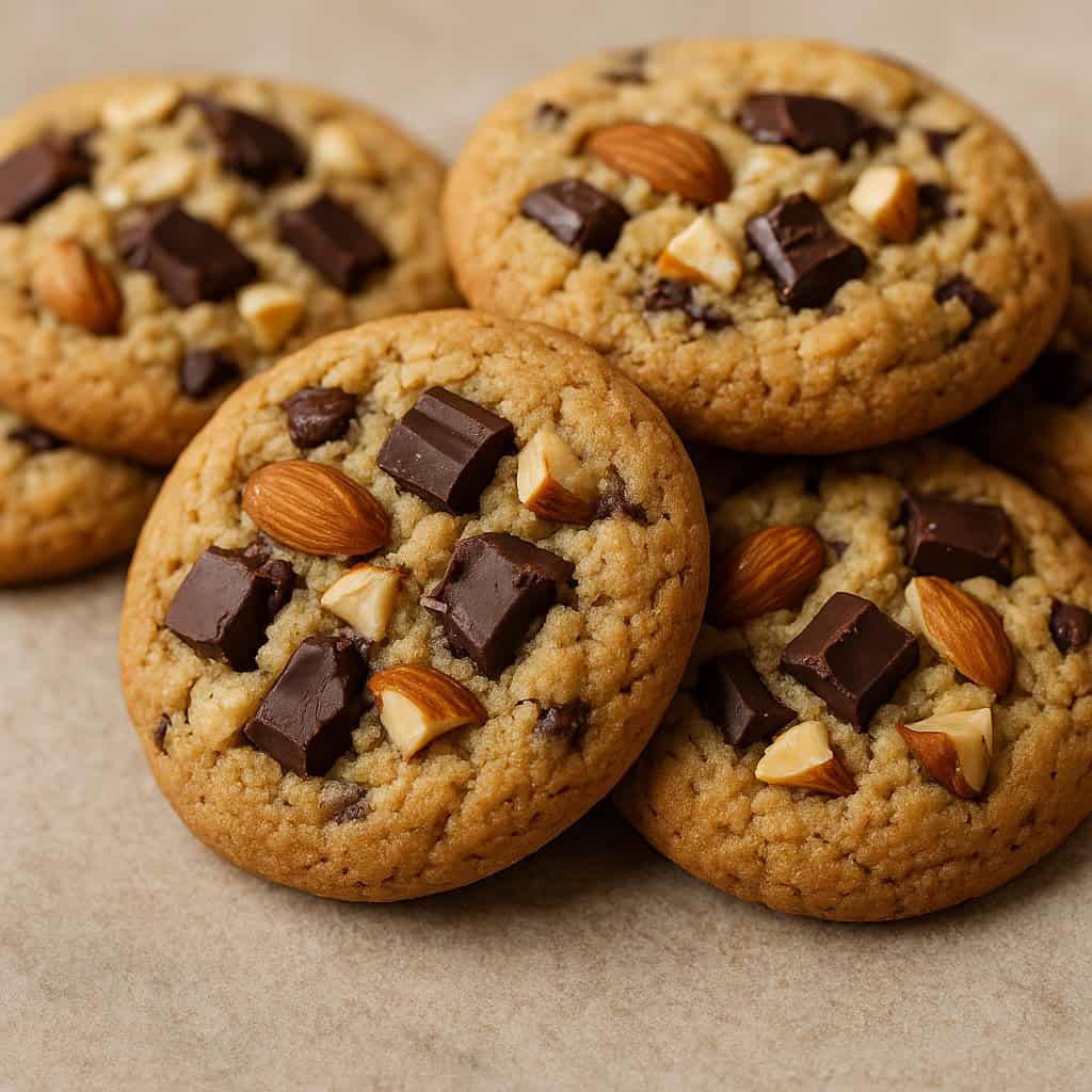 Τραγανά απ’ έξω, μαλακά στο εσωτερικό, με πλούσια κομμάτια σοκολάτας και τραγανά αμύγδαλα, αποτελούν την ιδανική λιχουδιά για τον καφέ, το τσάι ή ακόμα και για κέρασμα σε φίλους και οικογένεια.