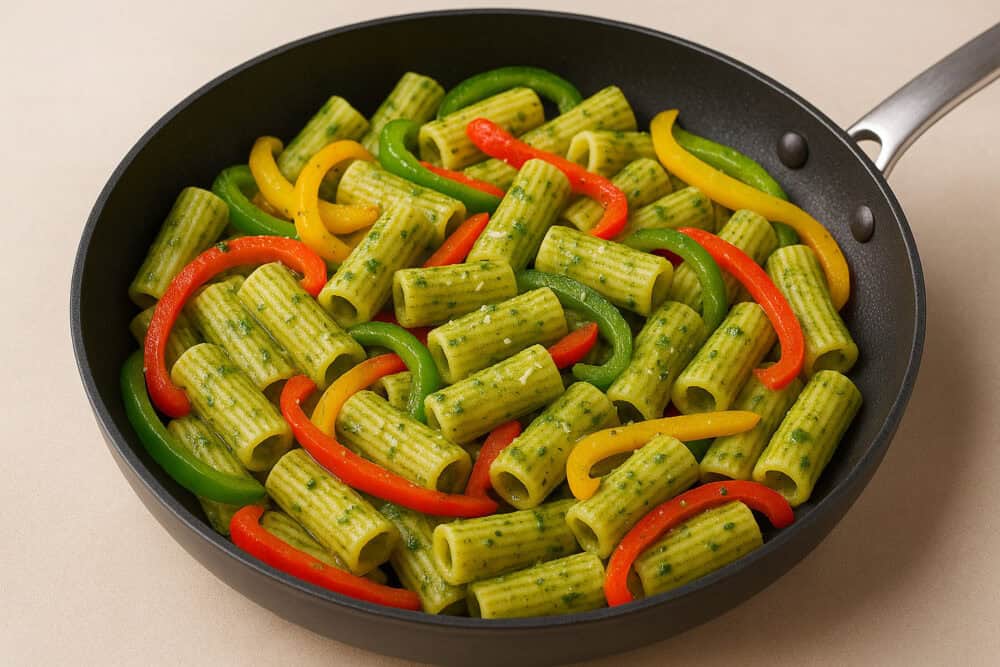 Προσθέτουμε τα στραγγισμένα ριγκατόνι στο τηγάνι με τις πιπεριές, ρίχνουμε το πέστο και ανακατεύουμε απαλά για να καλυφθούν όλα τα ζυμαρικά.