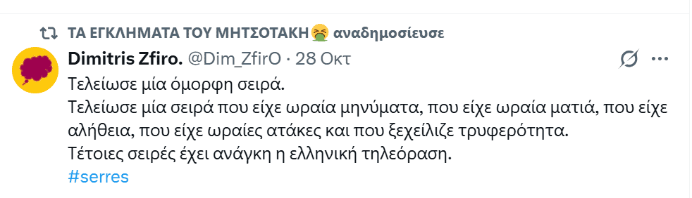 Λίγα λεπτά μετά την προβολή του επεισοδίου, το Twitter (ή Χ όπως ονομάζεται πλέον) πλημμύρισε από μηνύματα αγάπης και θαυμασμού για τον δημιουργό. Οι χρήστες αποθέωσαν τον Γιώργο Καπουτζίδη για τον τρόπο που έκλεισε τη σειρά, για τη γενναιότητα με την οποία αγγίζει κοινωνικά ζητήματα αλλά και για την ειλικρίνεια της γραφής του.
