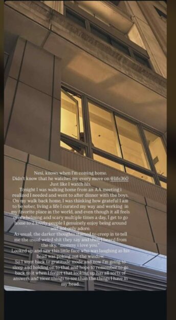 «Επέστρεφα στο σπίτι από μία συνάντηση των Ανώνυμων Αλκοολικών και συνειδητοποίησα ότι είχα ανάγκη να πάω για ένα δείπνο με τους γιους μου. Επιστρέφοντας, σκεφτόμουν πόσο ευγνώμων είμαι που είμαι καθαρή, ζώντας μια ζωή που έχω διαμορφώσει η ίδια και δουλεύοντας στο πιο αγαπημένο μου μέρος στον κόσμο».
