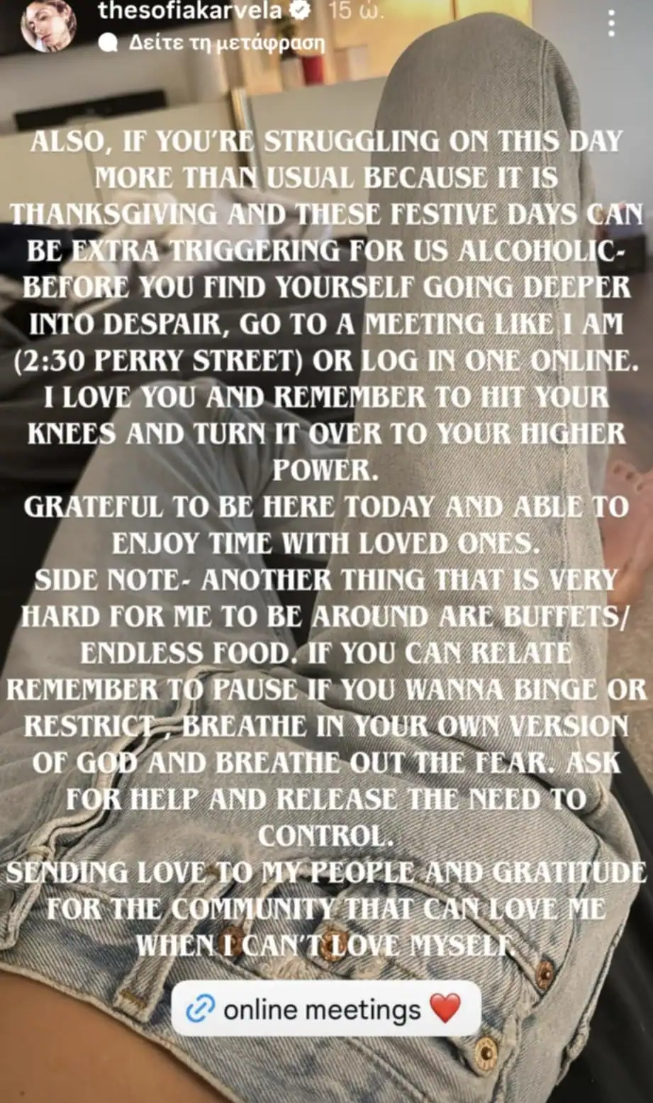 «Αν σήμερα δυσκολεύεσαι περισσότερο από άλλες φορές επειδή είναι Ημέρα των Ευχαριστιών – και γιατί αυτές οι γιορτινές ημέρες είναι συχνά πολύ απαιτητικές για εμάς τους αλκοολικούς– πριν νιώσεις ότι βυθίζεσαι ακόμη πιο βαθιά, πήγαινε σε μια συνάντηση, όπως κάνω κι εγώ (2:30 Perry Street), ή μπες σε μία διαδικτυακά.