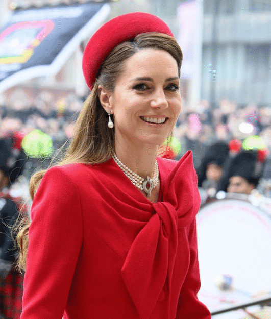Αντίστοιχα, η Κέιτ Μίντλετον, πριγκίπισσα της Ουαλίας, φορά το πλέον εμβληματικό κόσμημα της πεθεράς της: το μονόπετρο Garrard με μπλε ζαφείρι και διαμάντια, το οποίο επέλεξε ο πρίγκιπας Κάρολος για τον αρραβώνα τους το 1981.
