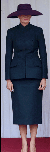 Στην άφιξή της στο Ουίνδσορ, η Μελάνια εμφανίστηκε με custom δημιουργία της Maria Grazia Chiuri για τον Dior – μια μοντέρνα εκδοχή του θρυλικού Bar suit. Το look ολοκληρώθηκε με βιολετί καπέλο του Stephen Jones, το οποίο κάλυπτε το μισό πρόσωπό της. Για πολλούς επικριτές, αυτή η επιλογή έδειξε τη διάθεση της να κρατήσει τις αποστάσεις, σε αντίθεση με την Καμίλα και την Κέιτ που διάλεξαν καπέλα που ανέδειξαν τα χαρακτηριστικά τους.