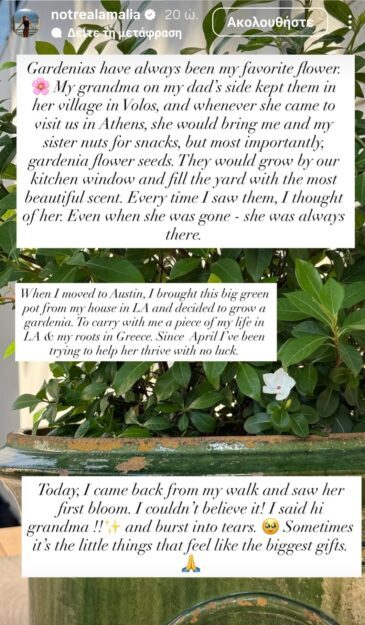 Μέσα από πρόσφατη ανάρτησή της στο Instagram, αποκάλυψε πόσο ξεχωριστές είναι για εκείνη οι γαρδένιες, που της θυμίζουν τη γιαγιά της από τον Βόλο (από την πλευρά του πατέρα της, Πέτρου Κωστόπουλου) και την παιδική της ηλικία στην Αθήνα. Με αφορμή το πρώτο άνθος που άνθισε στη γλάστρα που μετέφερε μαζί της στο Όστιν, η νεαρή κοπέλα μοιράστηκε τη συγκίνησή της, καθώς ένιωσε σαν να είχε μπροστά της την πολυαγαπημένη της γιαγιά.