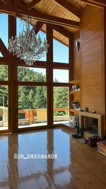 Η εξωτερική όψη της βίλας, με πέτρινη επένδυση και παραδοσιακό ορεινό στυλ, τραβά αμέσως το βλέμμα. Στο εσωτερικό, κυριαρχούν ξύλινες λεπτομέρειες και παρκέ που προσδίδουν θαλπωρή, ενώ το κυρίως σαλόνι ξεχωρίζει με τον μεγάλο πολυέλαιο και το εντυπωσιακό τζάκι, ιδανικό σημείο για στιγμές χαλάρωσης με θέα το δάσος. Τα μεγάλα παράθυρα αφήνουν το φυσικό φως να πλημμυρίζει τους χώρους, ενώ η μίνιμαλ και κομψή διακόσμηση ολοκληρώνει το αποτέλεσμα. Η βίλα περιλαμβάνει έξι υπνοδωμάτια και πολυτελείς ανέσεις, στοχεύοντας σε επισκέπτες που αναζητούν έναν συνδυασμό άνεσης, ηρεμίας και αποκλειστικότητας.