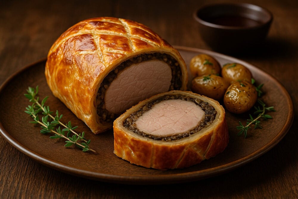 Όταν το βγάζεις από τον φούρνο, η σφολιάτα είναι χρυσαφένια και τραγανή ενώ από μέσα ξεπροβάλλει το ζουμερό κρέας, τυλιγμένο σε στρώσεις γεύσης που μοιάζουν με μικρές, γευστικές εκπλήξεις. Μανιτάρια που έχουν «λιώσει» μέσα στο θυμάρι, λεπτές φέτες προσούτο που δίνουν βάθος, ένα άρωμα από λευκό κρασί που κάνει το σύνολο να μοιάζει με πιάτο εστιατορίου σε στιγμή έμπνευσης.