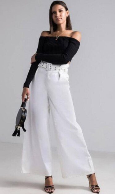 Για πιο σικ εμφανίσεις, συνδύασε τη λευκή παντελόνα με ένα μαύρο off-the-shoulder top, μαύρα πέδιλα και ένα μεσαίου μεγέθους τσαντάκι. Ο ασπρόμαυρος συνδυασμός είναι ασφαλής και ιδανικός για πολλαπλές περιστάσεις.
