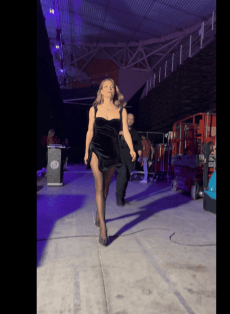 Η Χριστίνα Μπόμπα επιλέγει ένα maxi βελούδινο φόρεμα με ντραπέ σχέδια και τολμηρό leg cut, με έντονη αναφορά σε αισθητική παλιού Hollywood. Η custom suede ζώνη με metallic λεπτομέρειες τόνισε τη σιλουέτα της και πρόσθεσε δυναμισμό στην εμφάνιση.