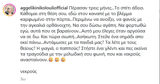 «Πέρασαν τρεις μήνες… Το σπίτι άδειο. Κάθομαι στη θέση σου, εδώ στον καναπέ, με το βλέμμα καρφωμένο στην πόρτα… Περιμένω να ανοίξει, να φανείς με την αγκαλιά ορθάνοιχτη. Να σου δώσω αγάπη. Να φορτωθώ εγώ όσα σε βαραίνουν… Αυτό μου έλεγες όταν αργούσα να σε δω. Και τώρα σιωπή… ασήκωτη. Στείλε ένα σημάδι από εκεί πάνω… Αντάμωσες με τα παιδιά μας; Τα λέτε με τους θείους; Η γιαγιά, ο παππούς; Στήστε ένα γλέντι και πες εκείνα τα τραγούδια με τη μελωδική σου φωνή, που και νεκρούς ανασταίνουν», έγραψε η Αγγελική Νικολούλη, δείχνοντας ακόμη μία φορά τη βαθιά αγάπη και αδυναμία που είχε στη μητέρα της.