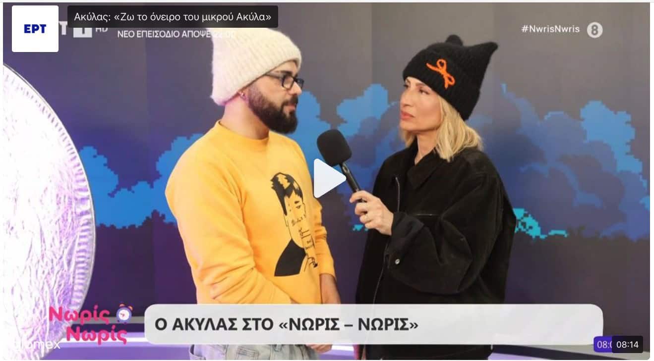 Τον εκπρόσωπο της Ελλάδας στη Eurovision 2026, Ακύλα, συνάντησε για τις ανάγκες της εκπομπής «Νωρίς Νωρίς» η Μαρία Ηλιάκη. Ο νεαρός performer μίλησε για την εμπειρία του, την ανταπόκριση του κοινού, αλλά και τη συνεργασία του με τον Φωκά Ευαγγελινό, αποκαλύπτοντας ότι όλο αυτό που ζει δεν το είχε καν φανταστεί ως ενήλικας.