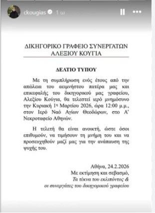«Με τη συμπλήρωση ενός έτους από την απώλεια του αειμνήστου πατέρα μας κι επικεφαλής του δικηγορικού μας γραφείου, Αλεξίου Κούγια, θα τελεστεί ιερό μνημόσυνο την Κυριακή 1η Μαρτίου 2026 και ώρα 12.00 μ., στον Ιερό Ναό Αγίων Θεοδώρων, στο Α’ Νεκροταφείο Αθηνών.