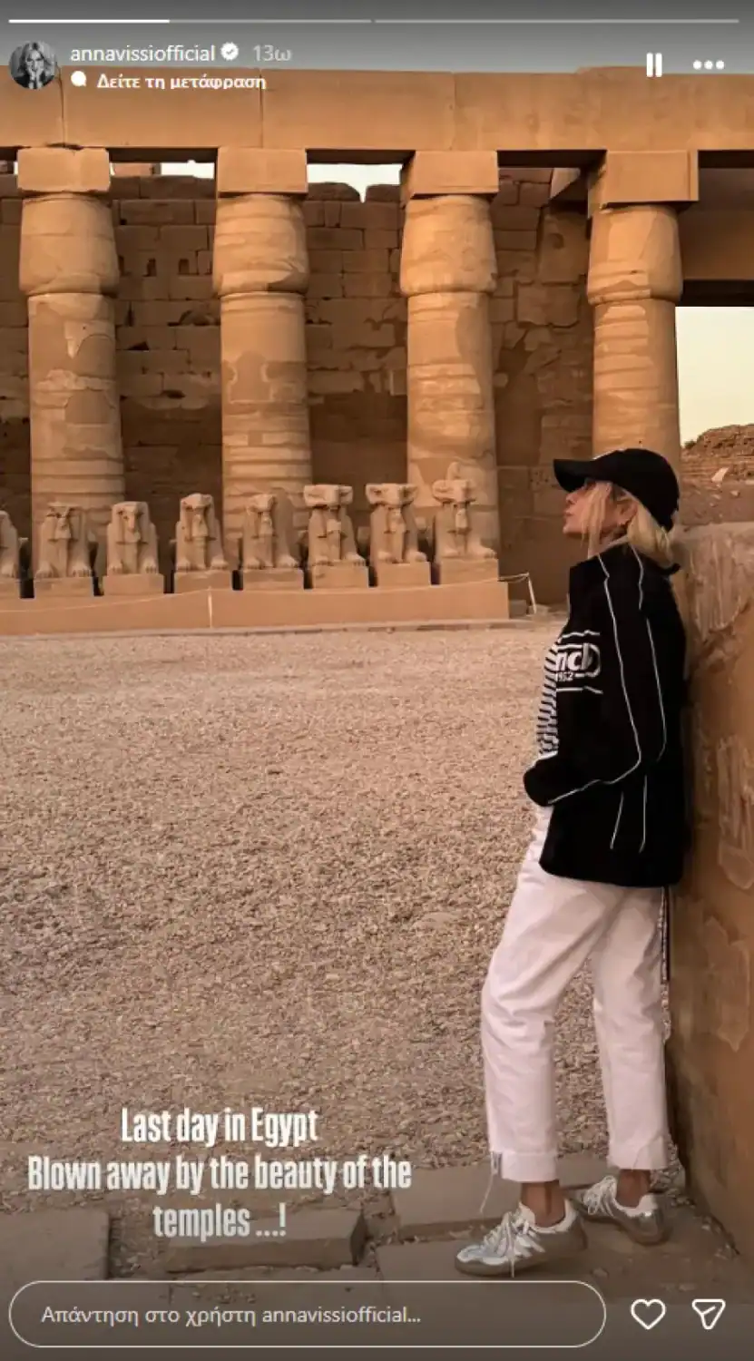 Η Άννα Βίσση κοινοποίησε στιγμιότυπα από τους ιστορικούς ναούς και τα αξιοθέατα που επισκέφθηκε, εντυπωσιάζοντας τους διαδικτυακούς της φίλους με τις εικόνες από το ταξίδι της. «Τελευταία μέρα στην Αίγυπτο. Εντυπωσιασμένη από την ομορφιά των ναών», έγραψε σε Instagram story που έκανε.