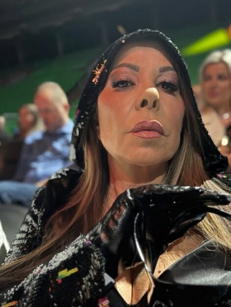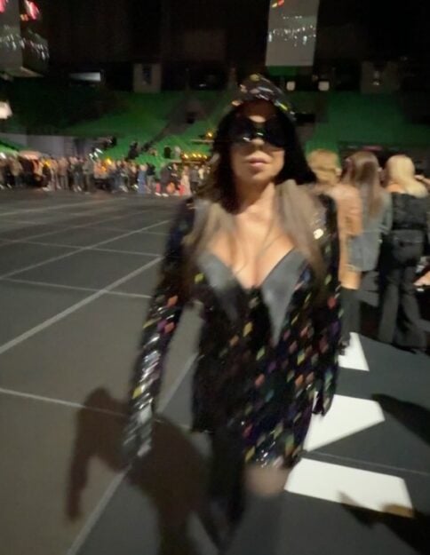 Η «Lady του ελληνικού τραγουδιού» επέλεξε μαύρο μίνι φόρεμα από παγέτες με πολύχρωμες λεπτομέρειες, ενώ ως πανωφόρι φόρεσε ένα παλτό forest green, που ταίριαζε χρωματικά με τις λάμψεις στο φόρεμα.