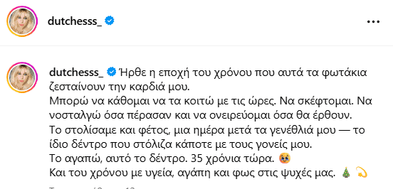 Η παρουσιάστρια μοιράστηκε μια ζεστή, τρυφερή φωτογραφία από το στολισμένο της δέντρο, φωτισμένο με πολύχρωμα λαμπάκια, την οποία συνοδεύει με λόγια γεμάτα αγάπη και νοσταλγία. Αποκάλυψε ότι το συγκεκριμένο δέντρο τη συντροφεύει εδώ και τριάντα πέντε χρόνια, από τότε που στόλιζε παιδί μαζί με τους γονείς της. Και φυσικά, φέτος δεν θα μπορούσε να λείπει από το σπίτι της.
