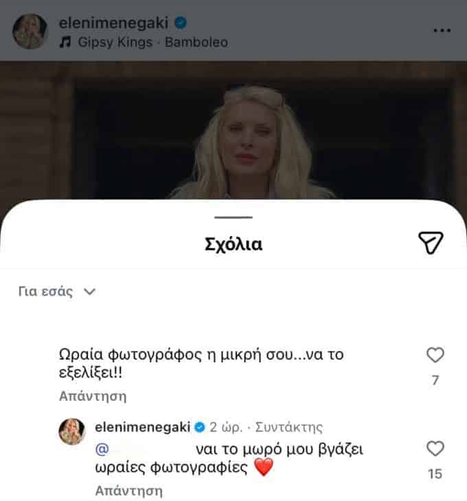 Οι followers της Ελένης Μενεγάκη δεν άφησαν ασχολίαστο το γεγονός, με πολλούς να ενθουσιάζονται και να προβλέπουν πως ίσως στο μέλλον δούμε τη μικρή Μαρίνα να ακολουθεί έναν… καλλιτεχνικό δρόμο πίσω από τον φακό!