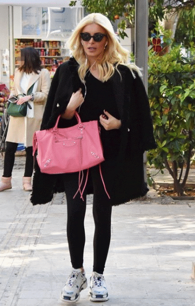 Η Κατερίνα Καινούργιου προτιμά την Balenciaga Classic City, μια iconic επιλογή που συνδυάζει rock αισθητική με πρακτικότητα, ιδανική για καθημερινή χρήση.