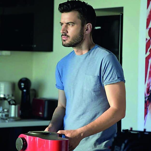 Ο Γιάννης Τσιμιτσλέλξς φαίνεται να απολαμβάνει ιδιαίτερα τον ρόλο του… σεφ! Η μοντέρνα κουζίνα με τα μαύρα ντουλάπια σε έντονη αντίθεση με τον τοίχο στο χρώμα της ώχρας μαρτυρά το προσωπικό του γούστο. Όλες οι απαραίτητες μικροσυσκευές βρίσκονται στη θέση τους, έτοιμες να εξυπηρετήσουν τις ανάγκες του ζευγαριού.