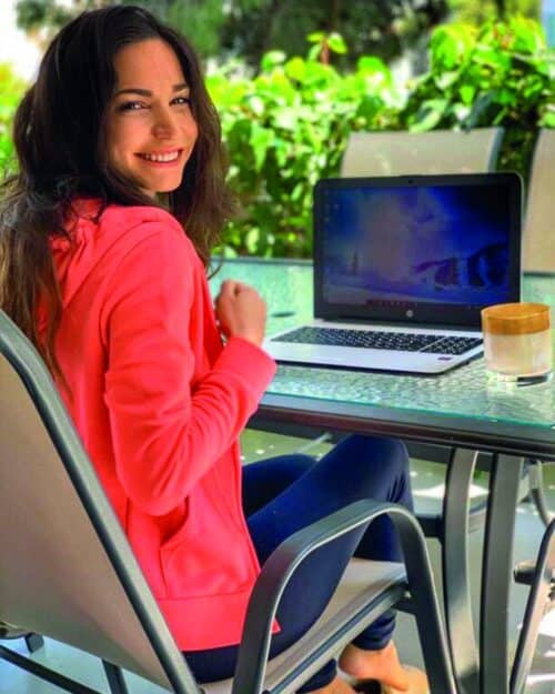 Στη βεράντα, ανάμεσα σε αρκετά φυτά, υπάρχει ένας μοντέρνος χώρος εργασίας. Γκρι σετ τραπεζαρίας από αλουμίνιο με γυάλινη επιφάνεια δημιουργεί το ιδανικό σκηνικό για δημιουργικές στιγμές. Η Κατερίνα Γερονικολού φαίνεται να το έχει αγαπήσει ιδιαίτερα.
