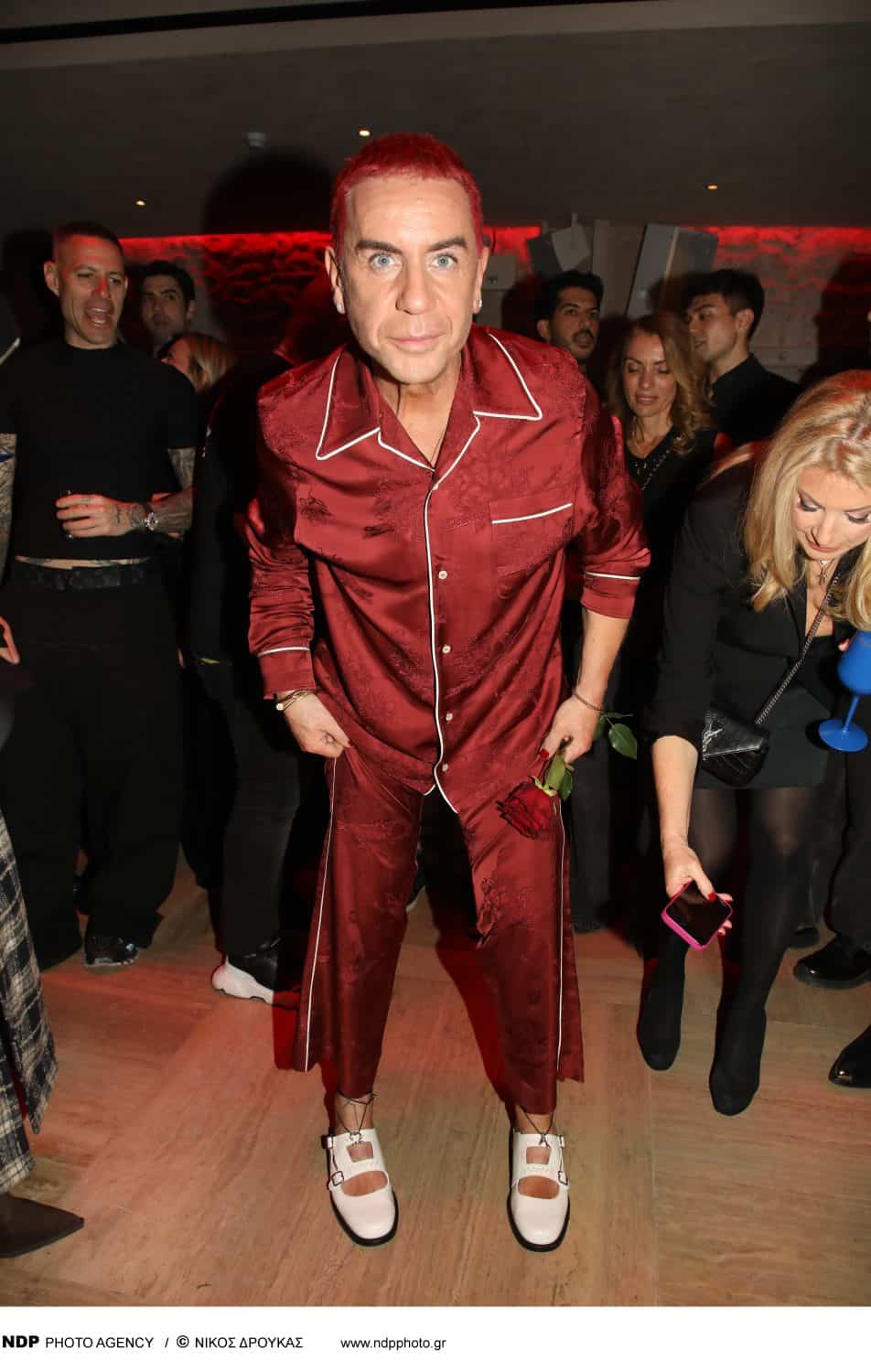 Το κόκκινο έγινε προέκταση της προσωπικότητάς του: παθιασμένο, τολμηρό, πρωτοποριακό. Τα μαλλιά και τα νύχια του βαμμένα στην ίδια απόχρωση, τα εκκεντρικά παπούτσια να ολοκληρώνουν μια εικόνα που δεν περνούσε απαρατήρητη. Ήταν, για ακόμη μία φορά, ο εαυτός του. Χωρίς εκπτώσεις.