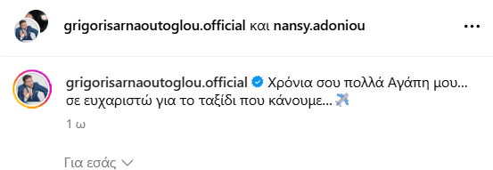 Ο δημοφιλής παρουσιαστής, παρότι σπάνια μιλά για την προσωπική του ζωή, δεν έχασε την ευκαιρία να εκφράσει δημόσια τη χαρά του για τη σχέση τους. Ο Γρηγόρης Αρναούτογλου ανάρτησε μία όμορφη κοινή φωτογραφία τους, συνοδεύοντάς την με τη λεζάντα: