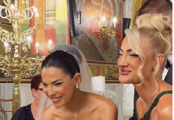 Η νύφη έφτασε στην εκκλησία γεμάτη συγκίνηση, φορώντας ένα εντυπωσιακό νυφικό που ανέδεικνυε τη σιλουέτα της. Μόλις αντίκρισε τον αγαπημένο της στον προαύλιο χώρο, τα μάτια της γέμισαν δάκρυα χαράς. Στο μεταξύ, η κουμπάρα Ιωάννα Τούνη έκλεψε τις εντυπώσεις με ένα λαμπερό πράσινο σμαραγδί φόρεμα γεμάτο στρας, συνοδευόμενη από τον σύντροφό της, Ρόμπι.