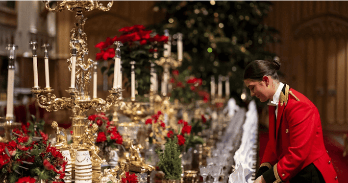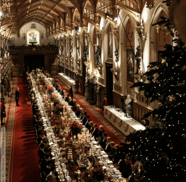 Η αίθουσα του Αγίου Γεωργίου ήταν πραγματικά μαγευτική: 158 κεριά φώτιζαν το τεράστιο τραπέζι, ενώ ένα χριστουγεννιάτικο δέντρο ύψους έξι μέτρων δέσποζε στον χώρο. Η προετοιμασία ήταν υποδειγματική — 152 θέσεις, 329 μαχαίρια, 320 κουτάλια και 760 ποτήρια είχαν στηθεί με απόλυτη ακρίβεια. Τα ασημένια κομμάτια του Grand Service ήταν στολισμένα με φρέσκα λουλούδια από τους κήπους του Ουίνδσορ, του Μπάκιγχαμ και του Savill Garden.