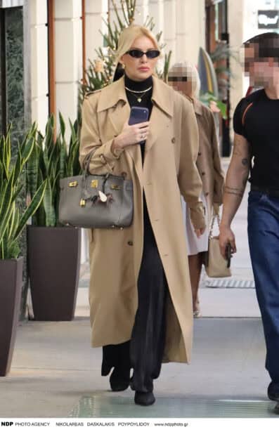 Η μπεζ καμπαρντίνα της, άψογα δομημένη και με minimal γραμμές, έδινε στην εμφάνισή της έναν αέρα διαχρονικής φινέτσας. Το μαύρο σύνολο από μέσα τόνιζε δημιουργούσε την τέλεια αντίθεση, ενώ η χαλαρή διάθεσή της έδειχνε πως απολαμβάνει βαθιά, προσωπικά συνειδητές στιγμές.