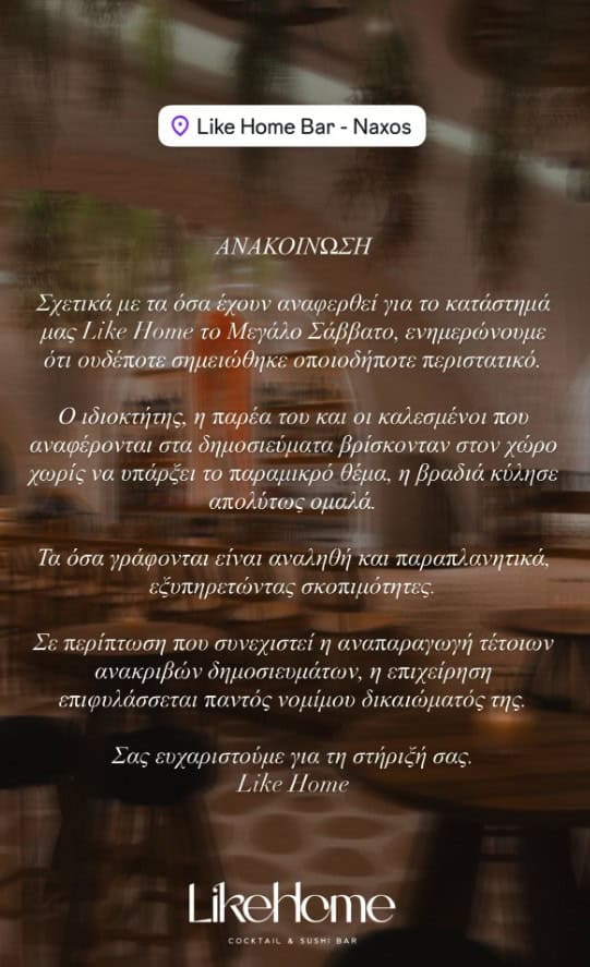 Παράλληλα, θέση πήρε και το κατάστημα όπου φέρεται να εκτυλίχθηκε το περιστατικό. Χωρίς να υιοθετεί υψηλούς τόνους, η πλευρά του αφήνει να εννοηθεί ότι δεν συνέβη κάτι αντίστοιχο με όσα περιγράφηκαν, επιχειρώντας να ρίξει τους τόνους και να αποκαταστήσει την αλήθεια.