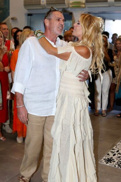 Ύστερα από δύο χρόνια σχέσης και αφού υπέγραψαν σύμφωνο συμβίωσης τον Ιούλιο, το ζευγάρι αποφάσισε να επισημοποιήσει την ένωσή του με έναν πολιτικό γάμο στα νότια προάστια. Στο πλευρό της αγαπημένης παρουσιάστριας βρέθηκε και η κόρη της, ηθοποιός Σοφίνα Λαζαράκη, που γνωρίσαμε από τον πρωταγωνιστικό της ρόλο στη σειρά του ΑΝΤ1 «Παρθένα Ζωή».