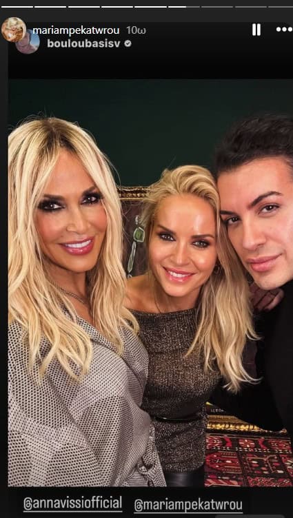 Στο πλευρό της βρισκόταν και η στενή φίλη της Άννας, Δήμητρα Κούστα, η οποία δίνει συχνά το «παρών» στις εμφανίσεις της αγαπημένης τραγουδίστριας. Οι δυο τους επισκέφθηκαν και το καμαρίνι της σταρ, όπου φωτογραφήθηκαν μαζί με τον καλό τους φίλο και hair stylist, Βασίλη Μπουλούμπαση.