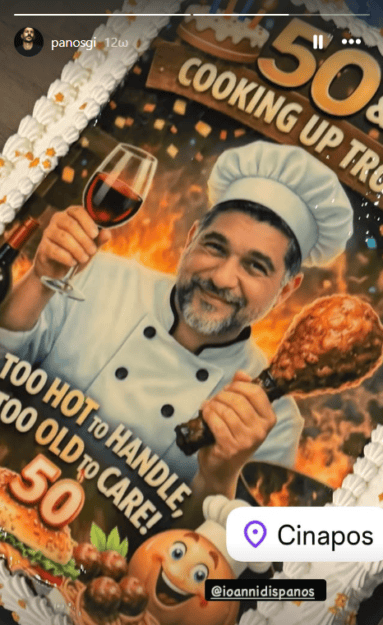 Ιδιαίτερη εντύπωση προκάλεσε η τούρτα γενεθλίων, φτιαγμένη ειδικά για τον Πάνο Ιωαννίδη, που απεικόνιζε τον ίδιο με τη λευκή στολή του σεφ. «Too hot to handle, too old to care» έγραφε η εντυπωσιακή τούρτα, με τη φωτογραφία του να κλέβει την παράσταση. Εκεί, μέσα σε χειροκροτήματα κι ευχές, αποκάλυψε πως έκλεισε τα πενήντα, με το κλίμα να είναι ιδιαίτερα κεφάτο.
