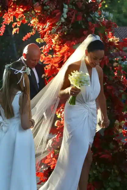 Κατά την άφιξη της νύφης στον ναό, το κλίμα ήταν ιδιαίτερα συγκινητικό. Οι καλεσμένοι ξέσπασαν σε χειροκροτήματα, με χαμόγελα και συγκίνηση να κυριαρχούν. Η Κατερίνα Μπιρμπίλη, κόρη της μουσικού και εκδότριας Αναστασίας Παπαδημητρίου, έλαμπε μέσα σε ένα νυφικό δια χειρός Χρήστου Κωσταρέλου με ανοιχτή πλάτη και σκίσιμο στο μπροστινό μέρος, ενώ το look της ολοκλήρωνε ένα μακρύ, αέρινο πέπλο που στόλιζε τα μαλλιά της.