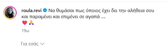 Τον δικό της τρυφερό ορισμό για την αγάπη μοιράστηκε μέσα από τον προσωπικό της λογαριασμό στο Instagram η Ρούλα Ρέβη, με αφορμή την Ημέρα των Ερωτευμένων.