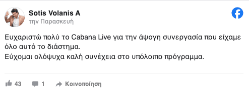 Από την πλευρά του, ο Σώτης Βολάνης τοποθετήθηκε μέσω ανάρτησής του στο Facebook, γράφοντας: «Ευχαριστώ πολύ το Cabana Live για την άψογη συνεργασία που είχαμε όλο αυτό το διάστημα. Εύχομαι ολόψυχα καλή συνέχεια στο υπόλοιπο πρόγραμμα».