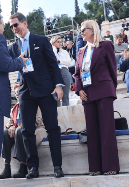 Η Μαρί Σαντάλ συνδυάζει αριστοκρατία και σοφιστικέ στιλ με ένα κομψό tailored κοστούμι σε μπορντό απόχρωση και παντελόνι καμπάνα. Το animal print στα ankle boots της δίνει μία ιδιαίτερη πινελιά πολυτέλειας και έντασης, αποδεικνύοντας ότι τα μποτάκια με λεοπάρ μοτίβο είναι statement κομμάτι που μπορεί να αναβαθμίσει ακόμα και ένα αυστηρό outfit.