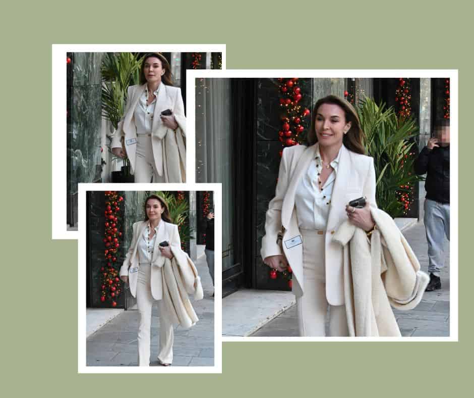 Φορώντας ένα λευκό κοστούμι σε tailored γραμμή, που αγκάλιαζε με κομψότητα το σώμα της, συνδύασε ένα λευκό πουκάμισο με διακριτική υφή και διαχρονική αισθητική. Το σύνολο ολοκληρώθηκε με ένα λευκό παλτό που κρατούσε ανάλαφρα στο χέρι της, προσθέτοντας έναν αέρα πολυτέλειας και φινέτσας στο όλο look.