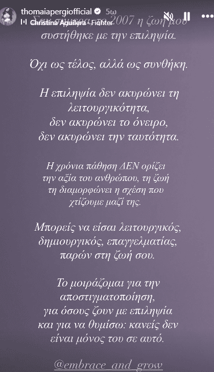Όπως έγραψε, η επιληψία μπήκε στη ζωή της σαν σήμερα, πριν από 19 χρόνια. «Σαν σήμερα το 2007 η ζωή μου συστήθηκε με την επιληψία. Όχι ως τέλος, αλλά ως συνθήκη. Η επιληψία δεν ακυρώνει τη λειτουργικότητα, δεν ακυρώνει το όνειρο, δεν ακυρώνει την ταυτότητα. Η χρόνια πάθηση δεν ορίζει την αξία του ανθρώπου· τη ζωή τη διαμορφώνει η σχέση που χτίζουμε μαζί της. Μπορείς να είσαι λειτουργικός, δημιουργικός, επαγγελματίας και παρών στη ζωή σου», ανέφερε, εξηγώντας πως μοιράζεται την εμπειρία της για την αποστιγματοποίηση και για να υπενθυμίσει ότι κανείς δεν είναι μόνος.