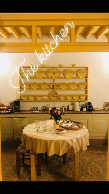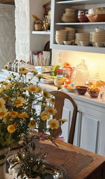 Η κουζίνα, με ασπρόμαυρα πλακάκια, ξύλινα ντουλάπια και πέτρινους τοίχους, μας ταξιδεύει στις δεκαετίες του ’70 και ’80. Η ροτόντα στο κέντρο και η ξύλινη πιατοθήκη στον τοίχο δίνουν έναν ρετρό τόνο, ενώ η ίδια η Τζένη Μπαλατσινού φροντίζει να μεταποιεί και να ανανεώνει έπιπλα με συναισθηματική αξία, δίνοντάς τους δεύτερη ζωή.