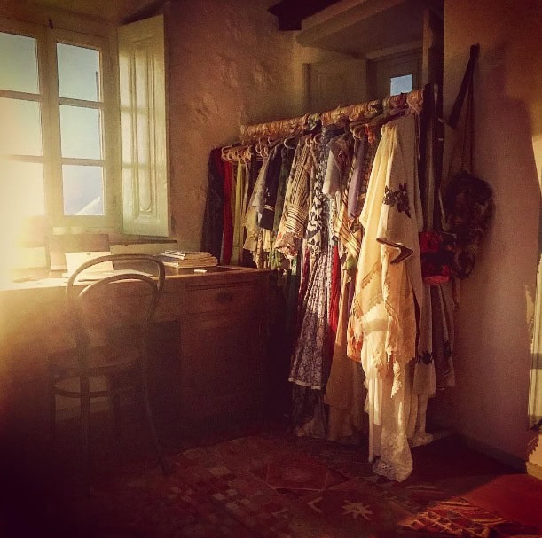 Η εξοχική κατοικία διαθέτει και γραφείο, όπου η παρουσιάστρια δουλεύει ή απλώς ησυχάζει απολαμβάνοντας τη θέα. Ένα vintage ξύλινο γραφείο μπροστά από φωτεινό παράθυρο, ψάθινη καρέκλα και ένα πορτοκαλοκόκκινο χαλί δημιουργούν έναν χώρο κομψό και λειτουργικό. Η Τζένη Μπαλατσινού έχει φροντίσει κάθε λεπτομέρεια, από την κρεμάστρα για τα φορέματα και τις τσάντες μέχρι τις γωνιές που συνδυάζουν αισθητική και πρακτικότητα.