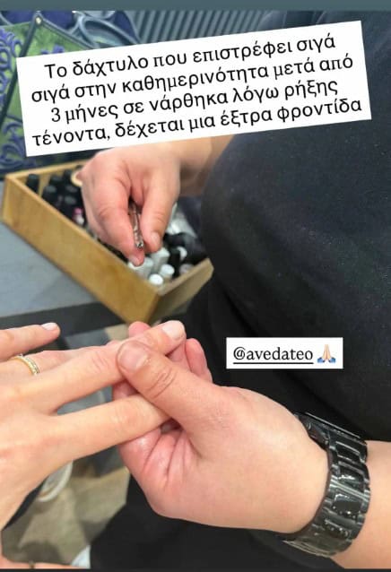 Μέσα από αναρτήσεις στον προσωπικό της λογαριασμό στο Instagram, η Ζέτα Δούκα ενημέρωσε τους διαδικτυακούς της φίλους για την πορεία της υγείας της, αποκαλύπτοντας ότι η κατάστασή της έχει πλέον αρχίσει να βελτιώνεται. Μάλιστα, όπως έκανε γνωστό, κατάφερε επιτέλους να αφαιρέσει τον νάρθηκα, κάτι που της επιτρέπει να επιστρέφει σταδιακά στην καθημερινότητά της. «Το δάχτυλό μου επιστρέφει σιγά σιγά στην καθημερινότητα μετά από 3 μήνες σε νάρθηκα λόγω ρήξης τένοντα, δέχεται μια έξτρα φροντίδα», έγραψε χαρακτηριστικά στην πρώτη της ανάρτηση.