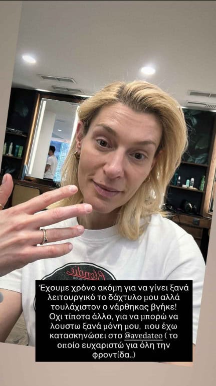 «Έχουμε χρόνο ακόμη για να γίνει ξανά λειτουργικό το δάχτυλό μου αλλά τουλάχιστον ο νάρθηκας βγήκε! Όχι τίποτα άλλο, για να μπορώ να λουστώ ξανά μόνη μου, που έχω καταστηκώνει στο @avedateo (το οποίο ευχαριστώ για όλη τη φροντίδα)», ανέφερε η Ζέτα Δούκα, δείχνοντας πως αντιμετωπίζει την κατάσταση με αισιοδοξία και καλή διάθεση.